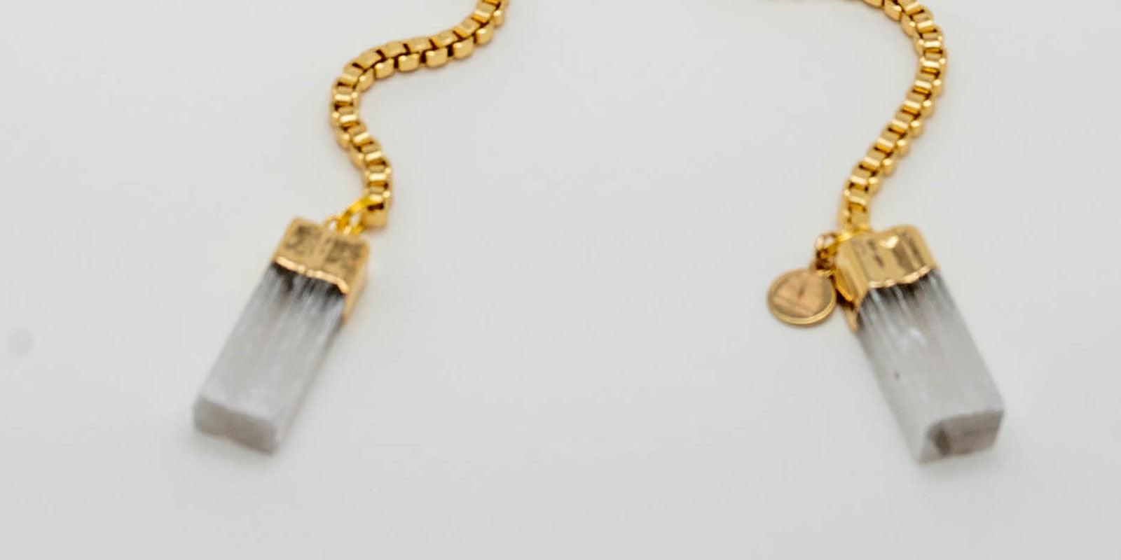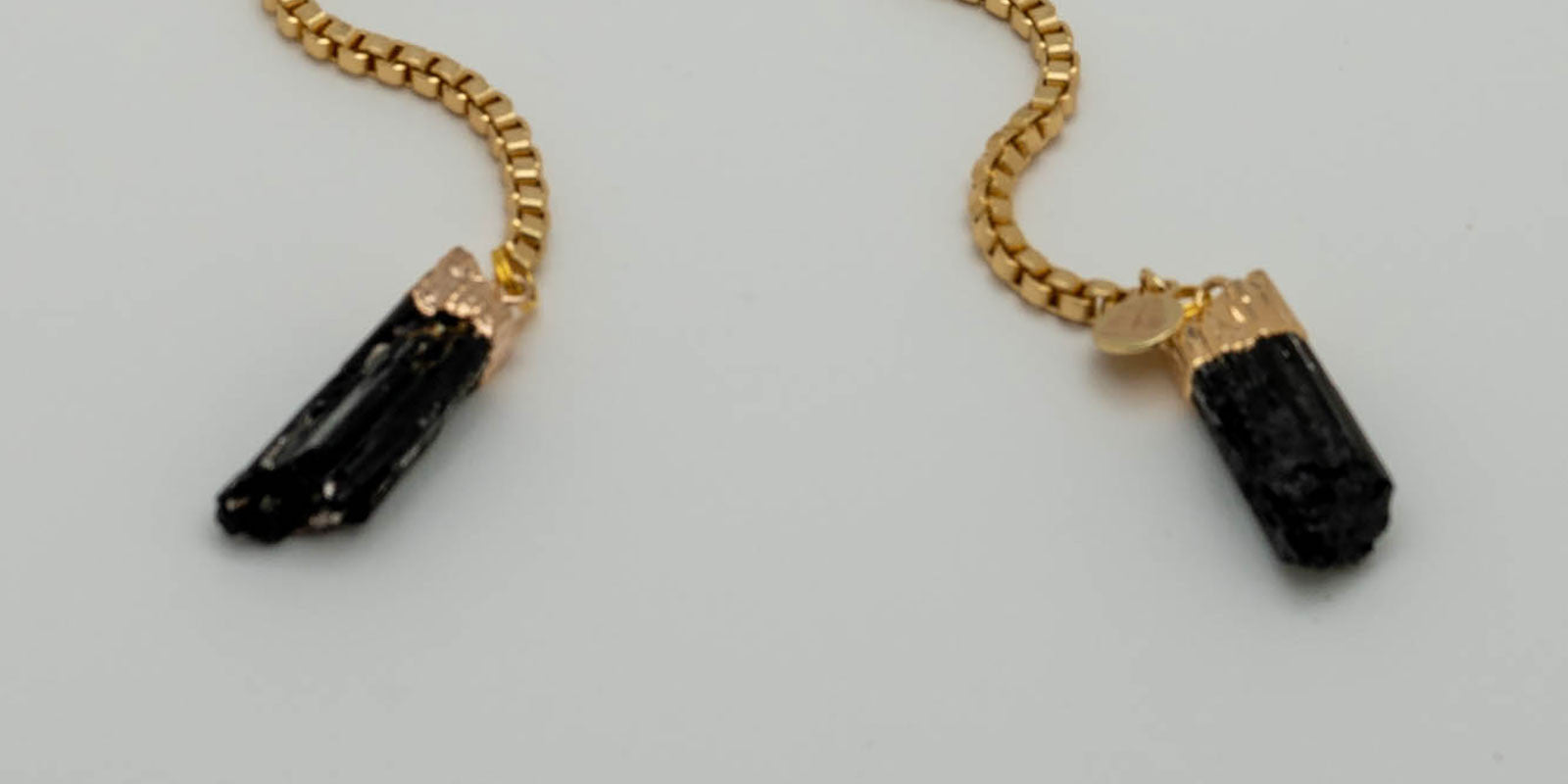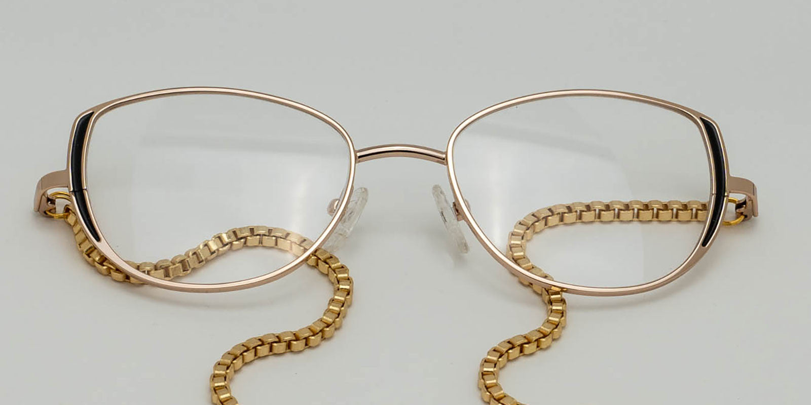 Gold metal cat eye frames. Gold chain. Black tourmaline.
