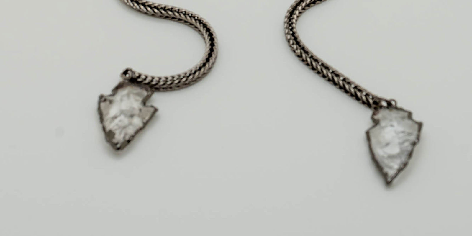 Square plastic frames.Gunmetal chain. Gunmetal plated clear quartz arrowheads.