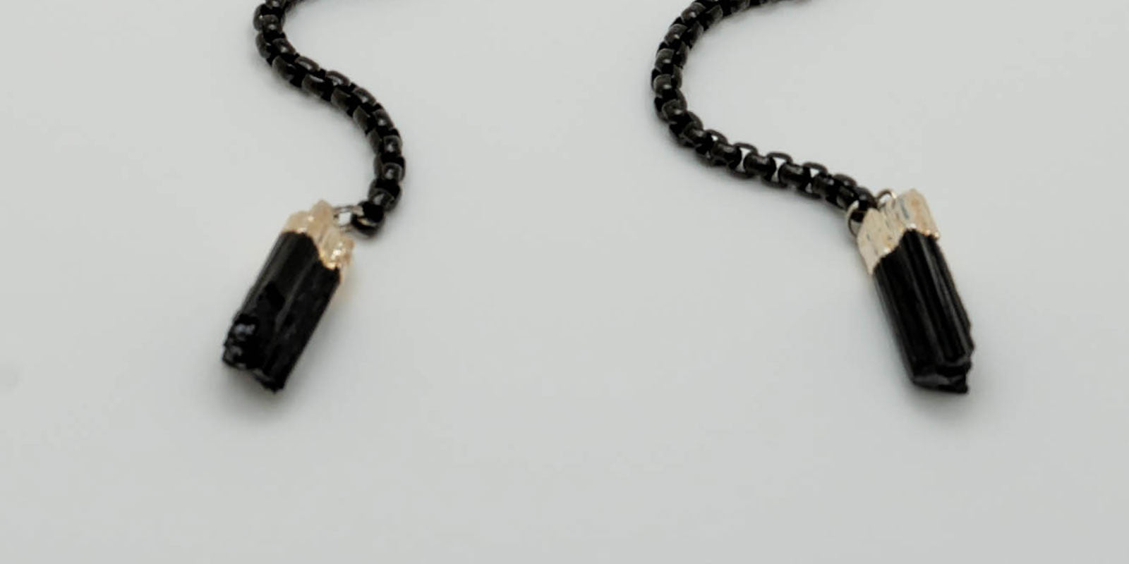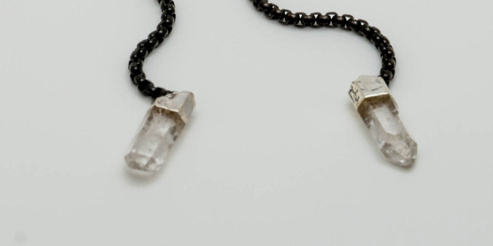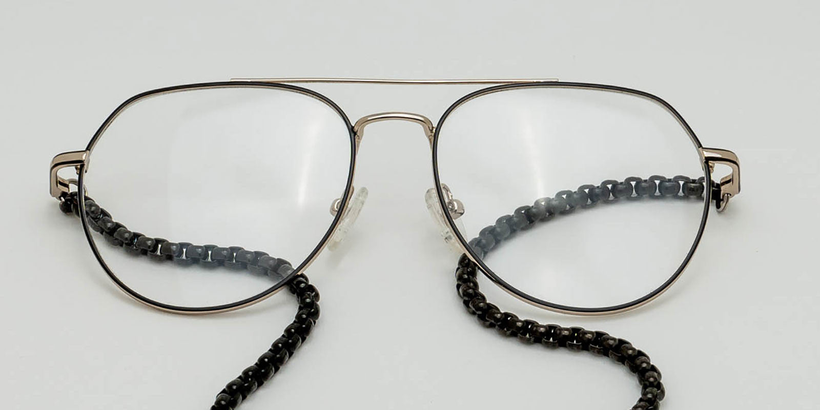 Black and silver metal aviator frames. Black stainless steel powder coated chain. Clear quartz.